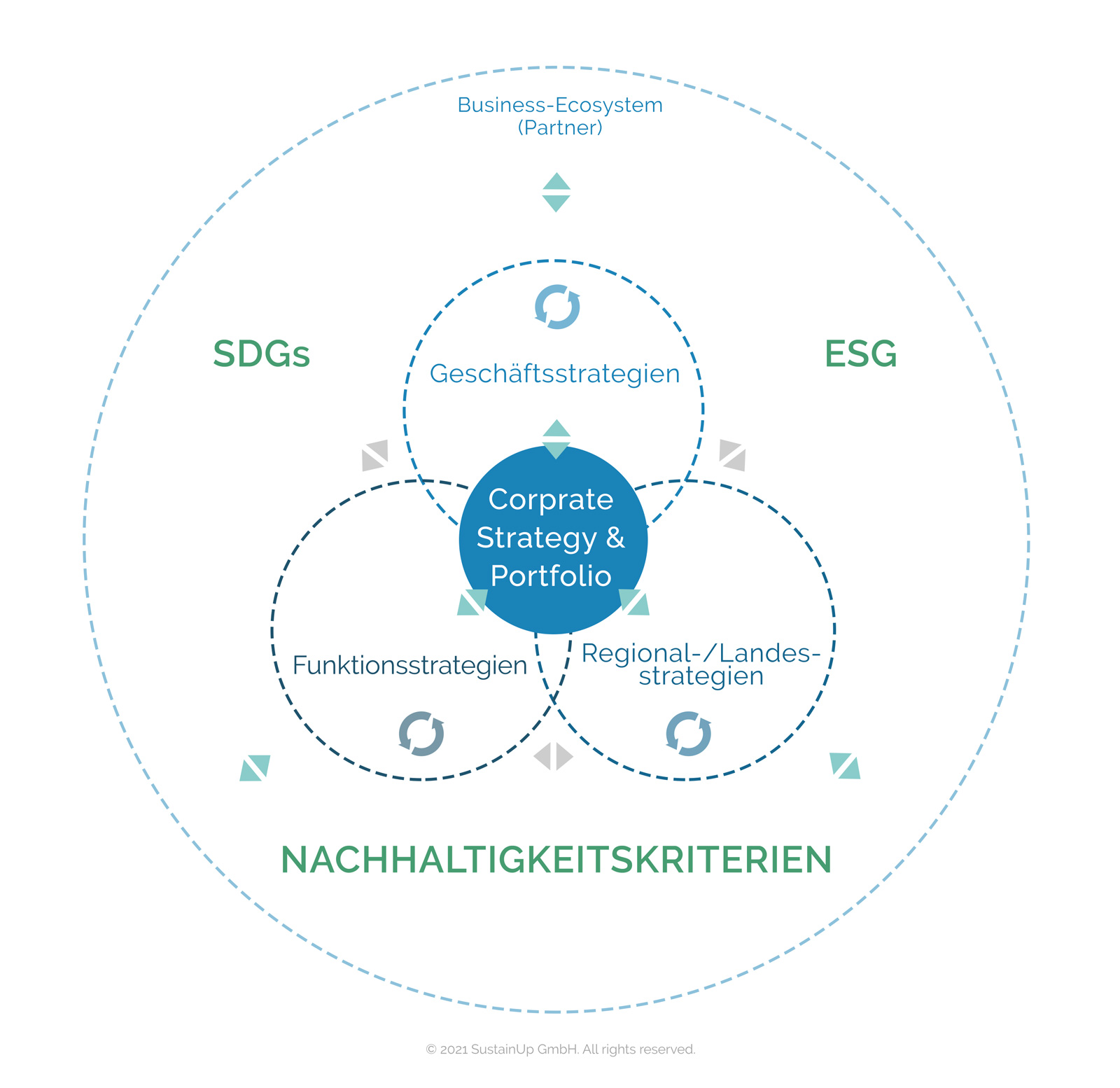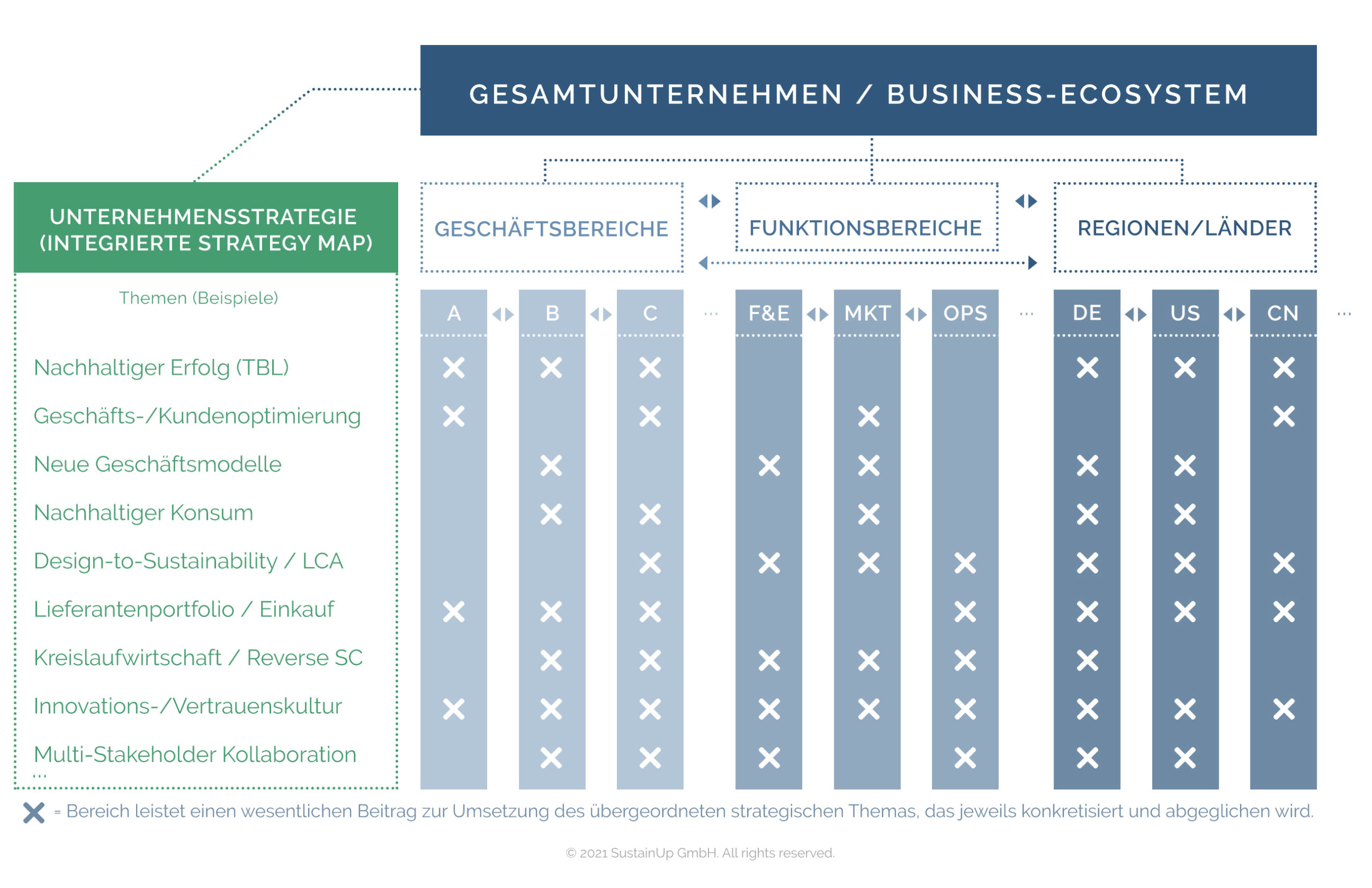 Wir helfen Ihnen, Strategie- und Nachhaltigkeitsthemen in Ihren Geschäftsbereichen, Landesgesellschaften, Funktionsbereichen und Partnerunternehmen relevant zu machen und miteinander abzugleichen.