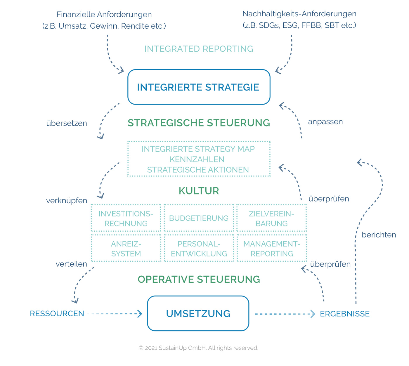 Budgets sowie individuelle Leistungsparameter der Mitarbeiter sind aus den strategischen Zielen der Organisation abgeleitet und mit dem Anreizsystem verknüpft. In der Investitionsrechnung ist festgelegt, wie innerhalb eines vorgegebenen Finanzrahmens konkurrierende Vorhaben priorisiert werden. Gerade hier zeigt sich, inwieweit ein propagierter Nachhaltigkeitsgedanke auch entscheidungsrelevant ist. Schließlich schafft ein integriertes internes Management Reporting durch konsistente, fokussierte und verlässliche Informationen die notwendige Transparenz über den Fortschritt. Eine authentische Führung und nachhaltigkeitsorientierte Unternehmenskultur liefern den Nährboden für die erforderlichen dynamischen Innovations- und Anpassungsprozesse und sind selbst wieder dadurch inspiriert.